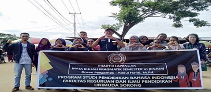 Sorong, Mahasiswa Semester Enam Kelas A Program Studi Pendidikan Bahaasa Indonesia FKIP UNIMUDA Sorong melakukan praktik lapangan mata kuliah pragmatik. Praktik lapangan ini akan dijadikan sebagai syarat bagi mahasiswa untuk mengikuti ujian akhir semester. Dalam kegiatan praktik lapangan mahasiswa melakukan pengamatan (mini riset) terhadap interaksi pedagang dan pembeli di Pasar Pagi Kabupaten Sorong. Selain itu, mahasiswa juga dituntut berinteraksi dengan penjual sesuai dengan prinsi-prinsip interaksi yang telah diajarkan dalam mata kuliah pragmatik.